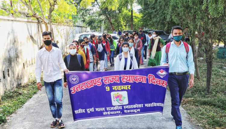 शहीद दुर्गा मल्ल राजकीय स्नातकोत्तर महाविद्यालय डोईवाला में राष्ट्रीय सेवा योजना के तत्वाधान में 21वे राज्य स्थापना दिवस समारोह उत्तराखंड महोत्सव के अंतर्गत एक रैली का आयोजन किया गया।