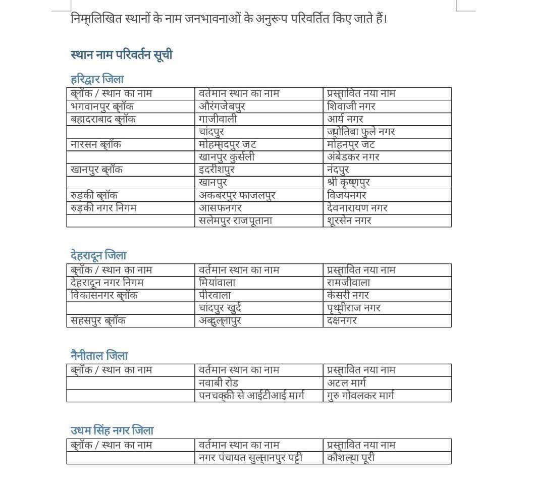 मुख्यमंत्री धामी द्वारा आज एक महत्वपूर्ण फैसला लेते हुए जनपद हरिद्वार, देहरादून, नैनीताल और उधम सिंह नगर में स्थित विभिन्न स्थानों के नाम में परिवर्तन की घोषणा की गई।