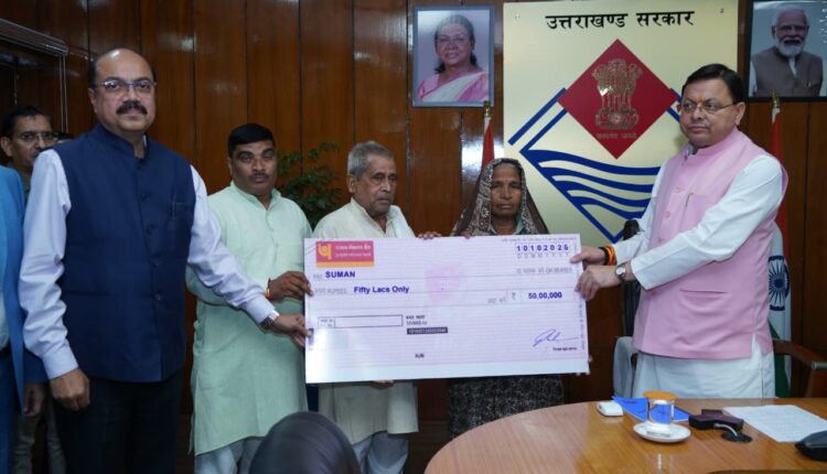 मुख्यमंत्री पुष्कर सिंह धामी ने उपनल कर्मियों के आश्रितों को सौंपे 50-50 लाख रुपये के चेक