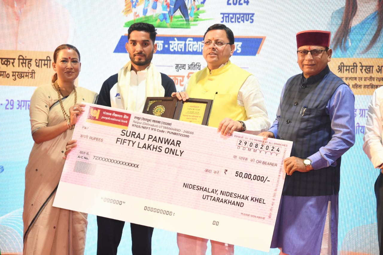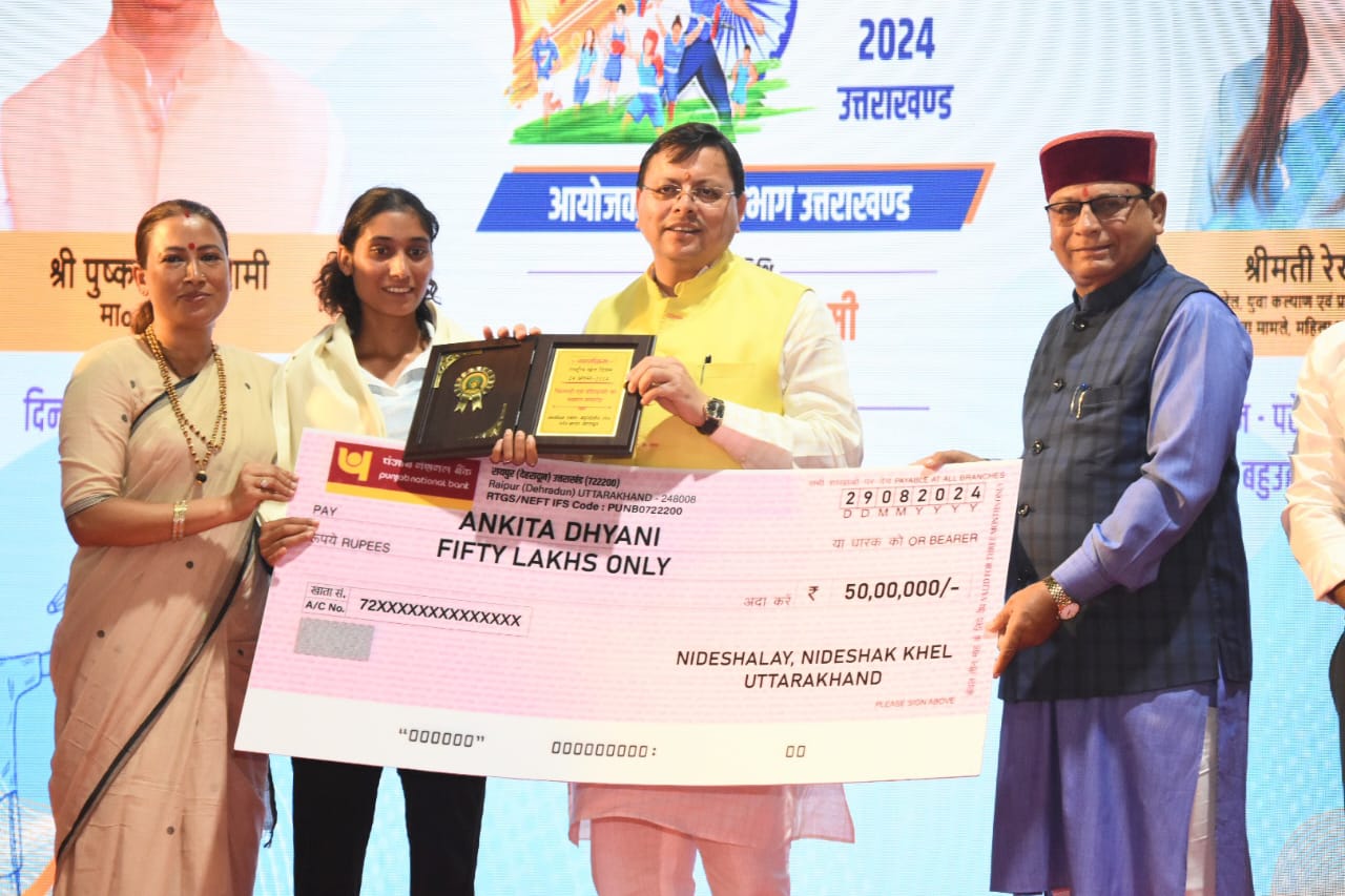 सीएम पुष्कर सिंह धामी ने गुरुवार को बहुउद्देशीय क्रीडा भवन, परेड ग्राउंड देहरादून में राष्ट्रीय खेल दिवस के अवसर पर आयोजित कार्यक्रम में सभी को खेल दिवस की शुभकामना दी तथा हॉकी के जादूगर के चित्र पर माल्यार्पण कर उन्हें श्रद्धांजलि अर्पित की। इस अवसर पर मुख्यमंत्री ने पेरिस ओलंपिक 2024 में प्रतिभाग करने वाले उत्तराखंड के 4 खिलाड़ियों ( लक्ष्य सेन, परमजीत सिंह, सूरज पंवार, अंकिता ध्यानी ) को 50 – 50 लाख की धनराशि के चेक प्रदान किये।