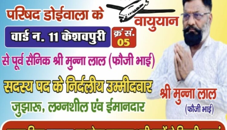डोईवाला नगर पालिका परिषद के केशवपुरी क्षेत्र के वार्ड नंबर 11 से निर्दलीय उम्मीदवार मुन्ना लाल फौजी भाई, जिन्हें क्षेत्र में फौजी भाई के नाम से जाना जाता है, ने अपनी चुनावी रैली में ढोल नगाड़ों के साथ प्रचार किया। चुनावी माहौल में अपनी अहम उपस्थिति दर्ज कराते हुए मुन्ना लाल फौजी ने वार्ड की जनता से अपना अमूल्य वोट देने की अपील की। रैली के दौरान, उन्होंने अपने चुनावी घोषणापत्र और भविष्य की योजनाओं को साझा किया।