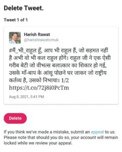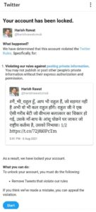 कांग्रेस के नेताओं के ट्विटर अकाउंट को ब्लॉक या फिर सस्पेंड करने का अभियान लगातार जारी है ..उत्तराखंड में कल गणेश गोदियाल कांग्रेस के प्रदेश अध्यक्ष का ट्विटर अकाउंट ब्लॉक कर दिया गया था वहीं अब हरीश रावत के ट्विटर अकाउंट को भी ब्लॉक किया गया है इसकी जानकारी खुद हरीश रावत ने फेसबुक पर दी#लोकतंत्र में मुझे चुप कराने की कोशिश की जा रही है। मैंने एक मुहिम के तहत #मैं_भी_Rahul हूंँ को लेकर एक दलित परिवार का जिक्र करते हुये एक ट्वीट किया था, Twitter इंडिया ने मेरा #Twitter अकाउंट – http://www.twitter.com/harishrawatcmuk ब्लॉक्ड कर दिया है, इस शर्त के साथ कि आप #मैं_भी_राहुल वाले ट्वीट को डिलीट कीजिये और अपना अकाउंट चालू करिये।