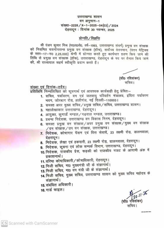 देहरादून। उत्तराखंड सरकार ने राज्य के वन विभाग में बड़ा प्रशासनिक फेरबदल करते हुए 1993 बैच के भारतीय वन सेवा (IFS) अधिकारी रंजन कुमार मिश्र को उत्तराखंड का नया प्रमुख वन संरक्षक (PCCF) एवं हेड ऑफ फॉरेस्ट फोर्स (HoFF) नियुक्त किया है। राज्यपाल की मंजूरी के बाद शासन ने उनके पदोन्नयन का आदेश जारी कर दिया है। इसके साथ ही उन्हें सर्वोच्च वेतनमान लेवल-17 (₹2,25,000) में तैनाती दी गई है।