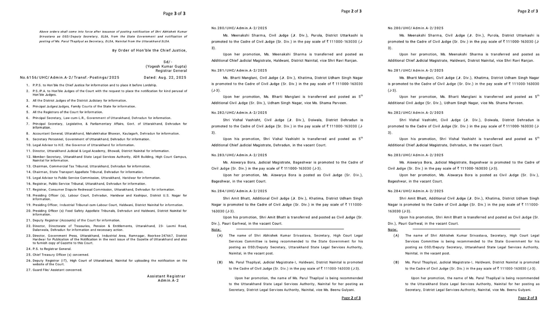 मीनाक्षी शर्मा, सिविल जज (जूनियर डिविजन) पुरोला (उत्तरकाशी) को भी सीनियर डिविजन कैडर में पदोन्नति दी गई।