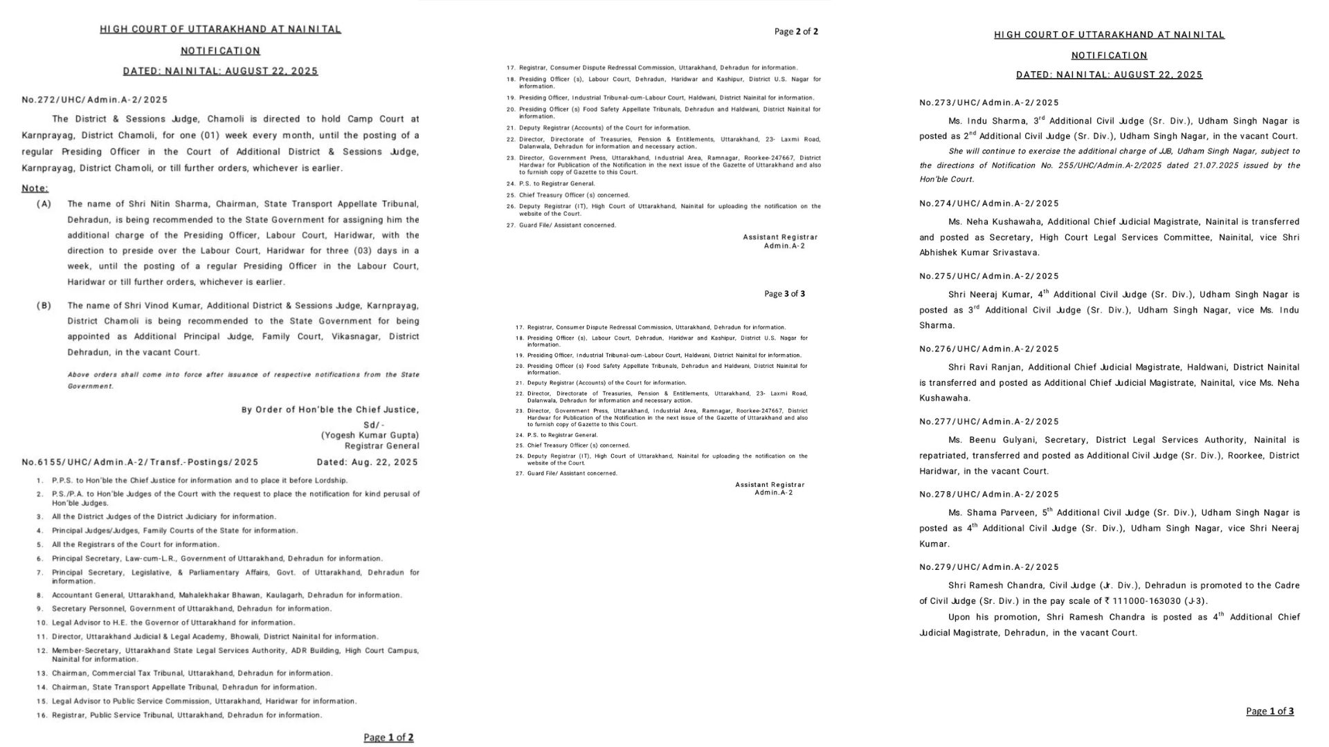देहरादून/नैनीताल: नैनीताल उच्च न्यायालय के आदेश पर उत्तराखंड में बड़ी संख्या में न्यायिक अधिकारियों के तबादले और पदस्थापन किए गए हैं। उच्च न्यायालय के रजिस्ट्रार जनरल द्वारा इस संबंध में आधिकारिक अधिसूचना जारी की गई है, जिसके तहत कई न्यायाधीशों और मजिस्ट्रेट्स को नई जिम्मेदारियां सौंपी गई हैं।