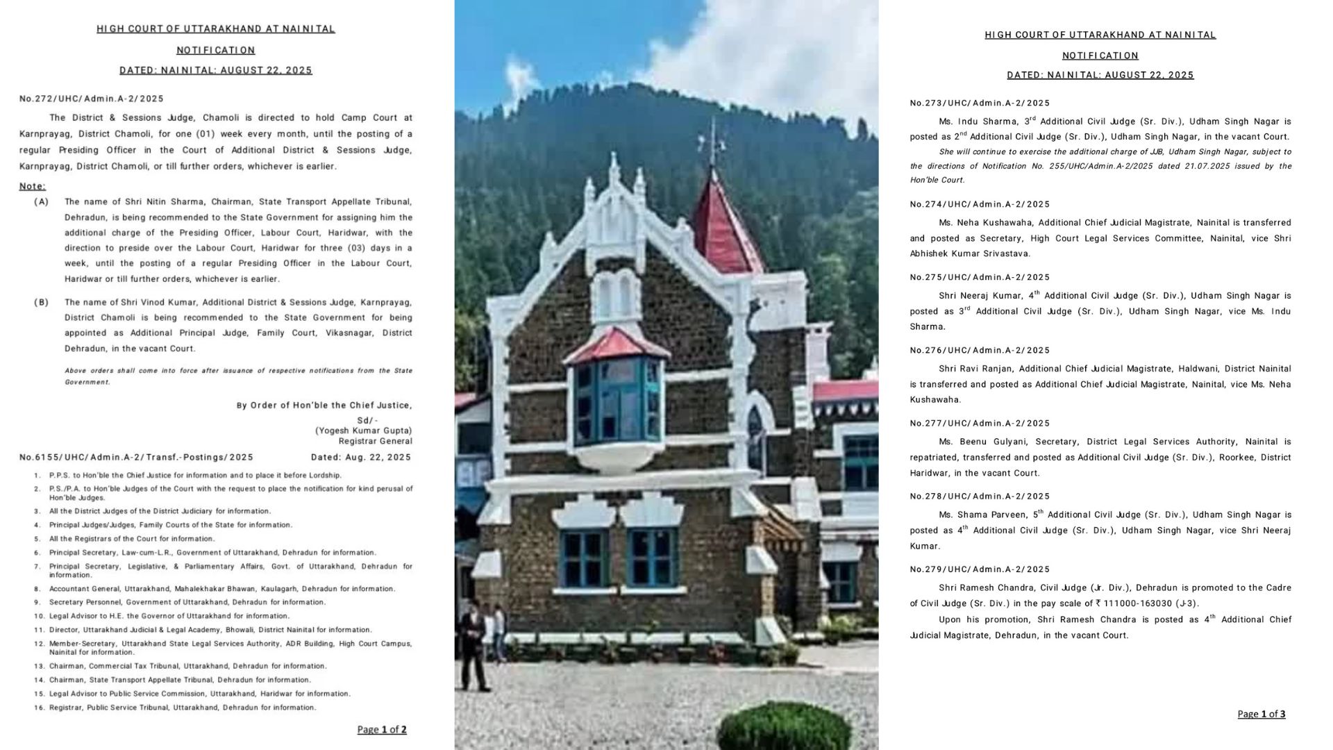देहरादून/नैनीताल: नैनीताल उच्च न्यायालय के आदेश पर उत्तराखंड में बड़ी संख्या में न्यायिक अधिकारियों के तबादले और पदस्थापन किए गए हैं। उच्च न्यायालय के रजिस्ट्रार जनरल द्वारा इस संबंध में आधिकारिक अधिसूचना जारी की गई है, जिसके तहत कई न्यायाधीशों और मजिस्ट्रेट्स को नई जिम्मेदारियां सौंपी गई हैं।