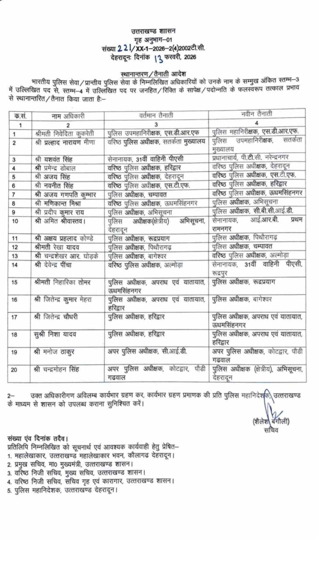 देहरादून: पुष्कर सिंह धामी सरकार ने शुक्रवार 13 फरवरी को पुलिस महकमे में बड़ा प्रशासनिक फेरबदल करते हुए IPS और PPS के कुल 20 अधिकारियों की जिम्मेदारियों में बदलाव कर दिया। इस सूची में राजधानी देहरादून और हरिद्वार जैसे सबसे अहम जिलों के एसएसपी भी शामिल हैं।
