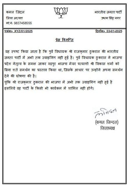 राजकुमार ठुकराल ने बीजेपी प्रदेश नेतृत्व के सामने जाकर रुद्रपुर बीजेपी मेयर प्रत्याशी विकास शर्मा को बिना शर्त समर्थन का प्रस्ताव किया था, जिसके आधार पर उन्होंने बीजेपी प्रत्याशी को अपना समर्थन दिया। लेकिन राजकुमार ठुकराल ने अभीतक बीजेपी ज्वाइंन नहीं की है. इसीलिए वो पार्टी के किसी कार्यक्रम में शामिल नहीं होगे। बता दें कि रुद्रपुर नगर निगम में मेयर पद के लिए पूर्व विधायक राजकुमार ठुकराल और उनके भाई ने निर्दलीय नामांकन किया था। नामांकन के बाद राजकुमार ठुकराल की देहरादून में सीएम पुष्कर सिंह धामी और बीजेपी के प्रदेश नेतृत्व से मुलाकात हुई थी। सीएम पुष्कर सिंह धामी से मुलाकात के बाद राजकुमार ठुकराल और उनके भाई ने अपना नामांकन वापस लिया था। साथ ही बीजेपी प्रत्याशी समर्थन देने की घोषणा की है। इसके बाद राजकुमार ठुकराल तीन जनवरी को बीजेपी प्रत्याशी के चुनाव कार्यालय भी पहुंचे थे। जहां उन्होंने सीएम पुष्कर सिंह धामी और बीजेपी के अन्य नेताओं की जमकर तारीफ की थी। लेकिन भाजपा ने अब लेटर जारी कर नया सस्पेंस खड़ा कर दिया है।
