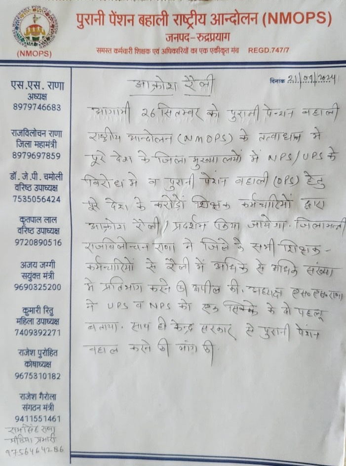 (NMOPS) रुद्रप्रयाग के अध्यक्ष एस०एस राणा एवं महामंत्री राजबिलोचन राणा ने बताया कि आगामी 26 सितम्बर को पुरानी पेन्शन बहाली राष्ट्रीय आन्दोलन (NMOPS) के तत्वाधान मे पूरे देश के जिला मुख्यालयों में NPS/UPS के विरोध में व पुरानी पेंशन बहाली (OPS) हेतु पूरे देश के करोड़ों शिक्षक कर्मचारियों द्वारा आक्रोश मार्च निकाला जाएगा तथा प्रदर्शन किया जायेगा।