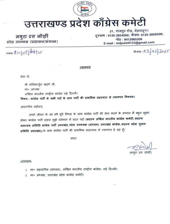 कांग्रेस पार्टी के वरिष्ठ नेता मथुरा दत्त ने पार्टी से इस्तीफा दे दिया है। उन्होंने अपने पत्र में बताया कि उन्होंने 48 वर्षों तक पूरी निष्ठा और समर्पण के साथ कांग्रेस पार्टी की सेवा की है, लेकिन अब वह कांग्रेस पार्टी के विभिन्न पदों (जैसे कि सदस्य अखिल भारतीय कांग्रेस कमेटी, सदस्य समन्वय समिति कांग्रेस पार्टी उत्तराखंड, प्रदेश उपाध्यक्ष (संगठन) उत्तराखंड कांग्रेस, सदस्य प्रदेश चुनाव समिति उत्तराखंड) और पार्टी की प्राथमिक सदस्यता से त्यागपत्र दे रहे हैं।