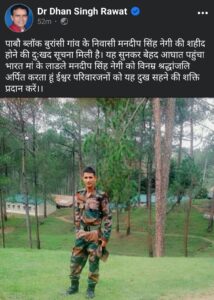 मिली जानकारी के अनुसार शहीद हुए वीर जवान मनदीप सिंह नेगी पाबौ ब्लॉक बुरांशी गांव के निवासी थे। मंत्री धन सिंह नेगी ने पाबौ ब्लॉक, बुरांसी गांव निवासी मनदीप सिंह नेगी की शहीद होने की दुःखद सूचना दी है और श्रद्धांजलि अर्पित की है। उन्होंने कहा ये खबर सुनकर बेहद आघात पहुंचा भारत मां के लाडले मनदीप सिंह नेगी को विनम्र श्रद्धांजलि अर्पित करता हूं। ईश्वर परिवारजनों को यह दुख सहने की शक्ति प्रदान करें।