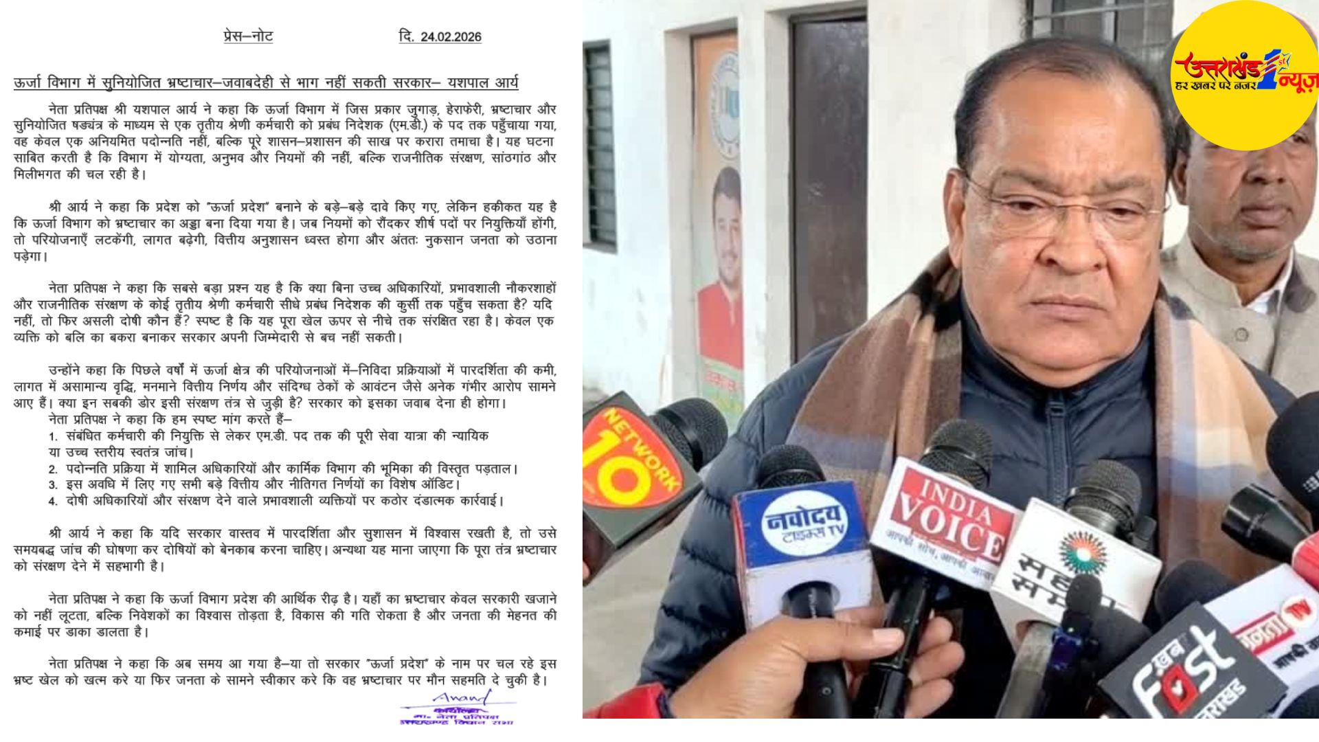देहरादून: उत्तराखंड के ऊर्जा विभाग में एक तृतीय श्रेणी कर्मचारी को प्रबंध निदेशक बनाए जाने के मामले ने सियासी तूल पकड़ लिया है। नेता प्रतिपक्ष यशपाल आर्या ने इसे शासन-प्रशासन की साख पर करारा तमाचा बताते हुए सरकार पर गंभीर आरोप लगाए हैं। उन्होंने पूरे मामले में जुगाड़, हेराफेरी, भ्रष्टाचार और सुनियोजित षड्यंत्र की आशंका जताते हुए उच्च स्तरीय जांच की मांग की है।
