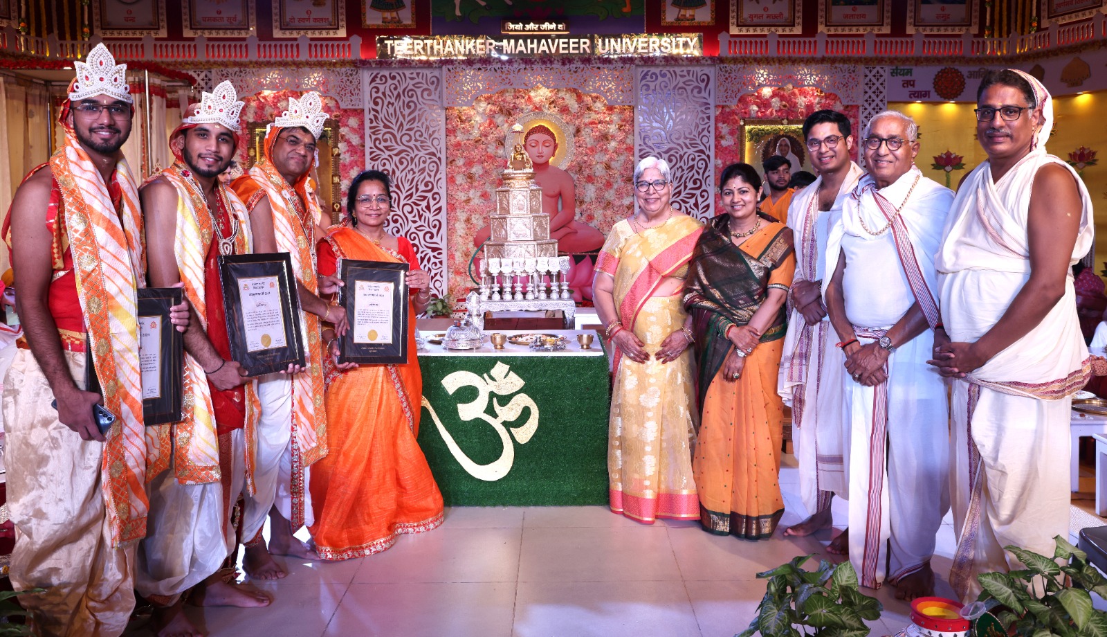 सिद्धार्थ जैन एंड पार्टी के सुरमय भजनों- अमृत से गगरी भरी…, कुटिया सूनी कर गए रे…, रंगमा रंगमा रे…, मंत्र णमोकार हमें प्राणों से भी प्यारा…, आए हम प्रभु तेरे दर पर…, तुम तो प्रभु वीतरागी मेरे मन की बेदी पर आप कब पधारोंगे…, आओ प्रभु मेरे मन मंदिर में…, रोम-रोम से निकले प्रभुजी नाम तुम्हारा…, थोड़ा पापों से डर थोड़ा कर्मों से डर जब मिलेगी सजा तो सुधर जाएगा…, सांवरिया पारसनाथ मुझे भी पार लगा दो…, ऊंचे-ऊंचे शिखरों वाला है तीर्थ हमारा…, भला हो राजा जी… आदि से रिद्धि-सिद्धि भवन श्रीजी की भक्ति में झूम उठा। दूसरी ओर उत्तम संयम धर्म पर मंगलचारण के साथ सांस्कृतिक संध्या का ऑडी में शुभारम्भ हुआ। टीएमयू फैकल्टीज़ और स्टाफ की ओर से दशलक्षण: आत्मिक उन्नति का पर्व नाटिका का मंचन किया गया। नाटिका के जरिए कालों की रचना के साथ-साथ मनुष्य की उत्पत्ति, जैन धर्म का उदय और विस्तार आदि को बताया। नाटिका में बताया, इस पंचम काल में पर्यूषण पर्व क्यों और कैसे मनाया जाता है। इससे पहले मां सरस्वती के समक्ष दीप प्रज्ज्वलित करके ऑडी में सांस्कृतिक संध्या का शुभारम्भ हुआ। श्रीजी की आरती को जिनालय से रिद्धि-सिद्धि भवन तक ले जाने का सौभाग्य वीसी प्रो. वीके जैन को मिला। महामहोत्सव में डॉ. विपिन जैन, श्री विपिन जैन, डॉ. एसके जैन, श्री मनोज जैन, डॉ. अक्षय जैन, डॉ. रवि जैन, डॉ. अर्चना, डॉ. रत्नेश, डॉ. नम्रता जैन, श्रीमती करुणा जैन, श्री संजय जैन, श्री वैभव जैन, श्री सार्थक जैन, श्री अक्षत जैन, श्री पवन जैन, श्री नमन जैन आदि उपस्थित रहे।