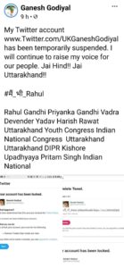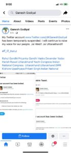 देहरादून । कांग्रेस के पूर्व राष्ट्रीय अध्यक्ष राहुल गांधी के बाद अब उत्तराखंड प्रदेश अध्यक्ष गणेश गोदियाल के ट्विटर अकाउंट को ट्विटर ने अस्थायी रूप से निलंबित कर दिया है। इससे खफा गोदियाल ने कहा कि वह अपने जनों की आवाज को हमेशा उठाते रहेंगे।