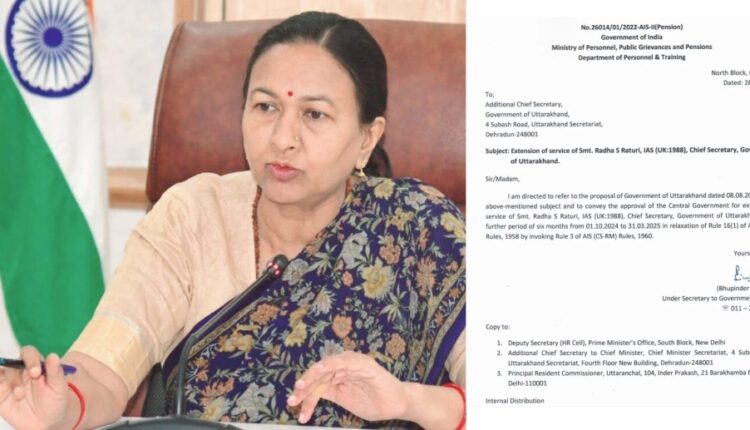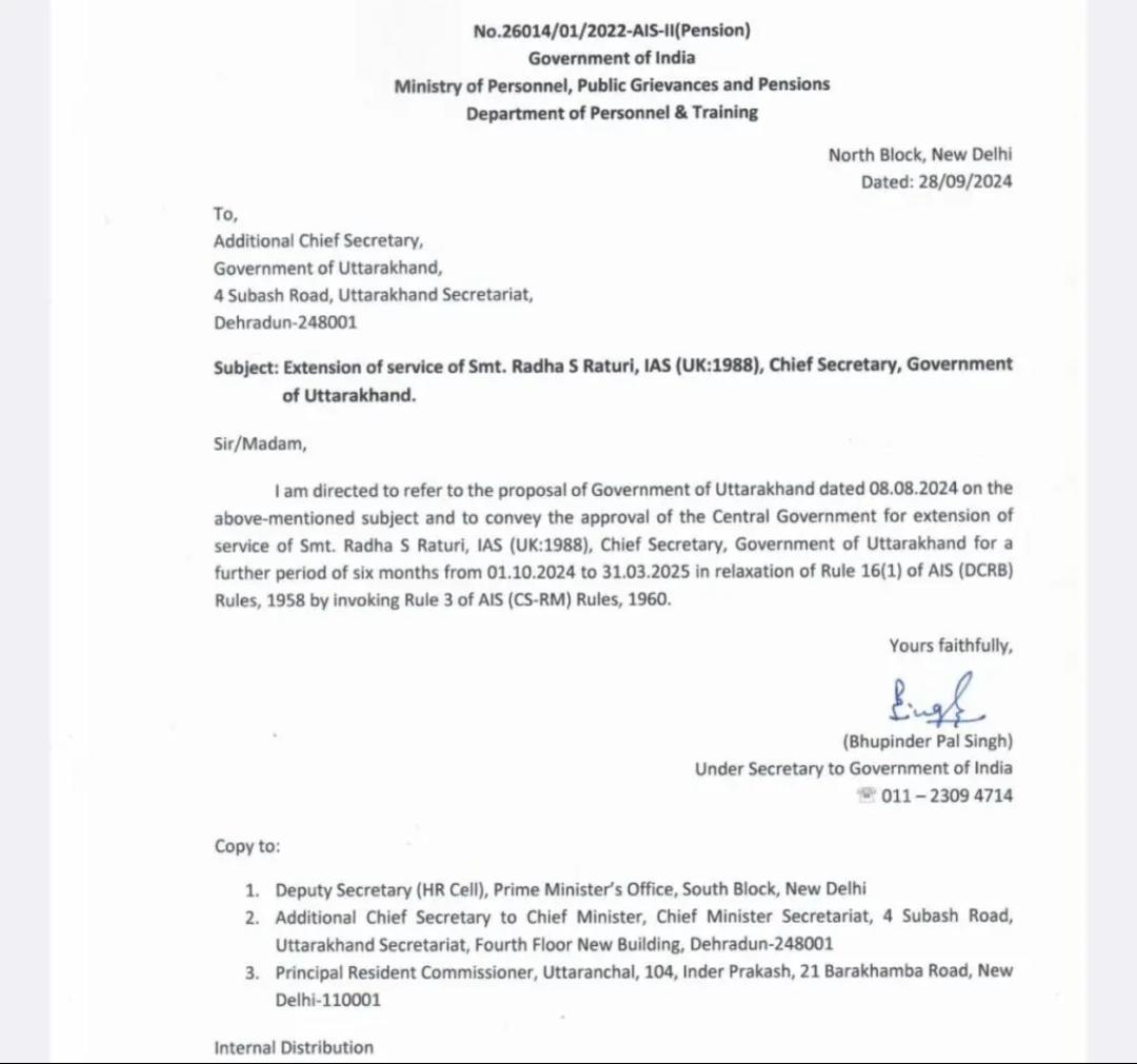 अपर सचिव भारत सरकार के द्वारा जारी आदेश के मुताबिक राधा एस रतूड़ी, आईएएस (यूके:1988), मुख्य सचिव, उत्तराखंड सरकार का सेवा विस्तार किया गया है ।उत्तराखंड सरकार के दिनांक 08.08.2024 के प्रस्ताव का संदर्भ लेने और एआईएस (डीसीआरबी) नियम, 1958 के नियम 16(1) में छूट देते हुए एआईएस (सीएस-आरएम) नियम, 1960 के नियम 3 को लागू करके राधा एस रतूड़ी, आईएएस (यूके:1988), मुख्य सचिव, उत्तराखंड सरकार की सेवा को 01.10.2024 से 31.03.2025 तक छह महीने की अतिरिक्त अवधि के लिए विस्तारित करने के लिए केंद्र सरकार की मंजूरी से अवगत कराने का निर्देश हुआ है।