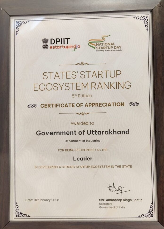 इस उपलब्धि के लिए राष्ट्रीय स्टार्टअप दिवस के अवसर पर उत्तराखण्ड सरकार के उद्योग विभाग को Certificate of Appreciation प्रदान किया गया। यह सम्मान इस बात का प्रमाण है कि राज्य में स्टार्टअप नीति के माध्यम से नवाचार, उद्यमिता, निवेश प्रोत्साहन और युवाओं को स्वरोजगार से जोड़ने की दिशा में प्रभावी कार्य किया गया है।