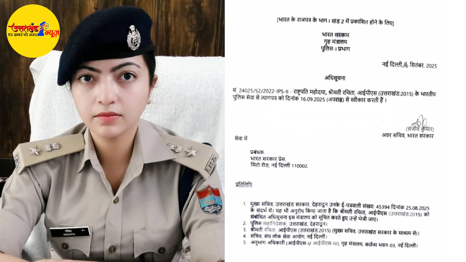 देहरादून। उत्तराखंड कैडर की 2015 बैच की होनहार और तेज़तर्रार आईपीएस अधिकारी रचिता जुयाल ने पुलिस सेवा से स्वैच्छिक सेवानिवृत्ति (VRS) ले ली है। राज्य सरकार ने उनके इस्तीफे को औपचारिक रूप से स्वीकार कर लिया है। रचिता ने मुख्य सचिव आनंद बर्द्धन को अपना त्यागपत्र भेजा था, जिसके बाद सरकार ने उनके वीआरएस आवेदन पर मुहर लगा दी।
